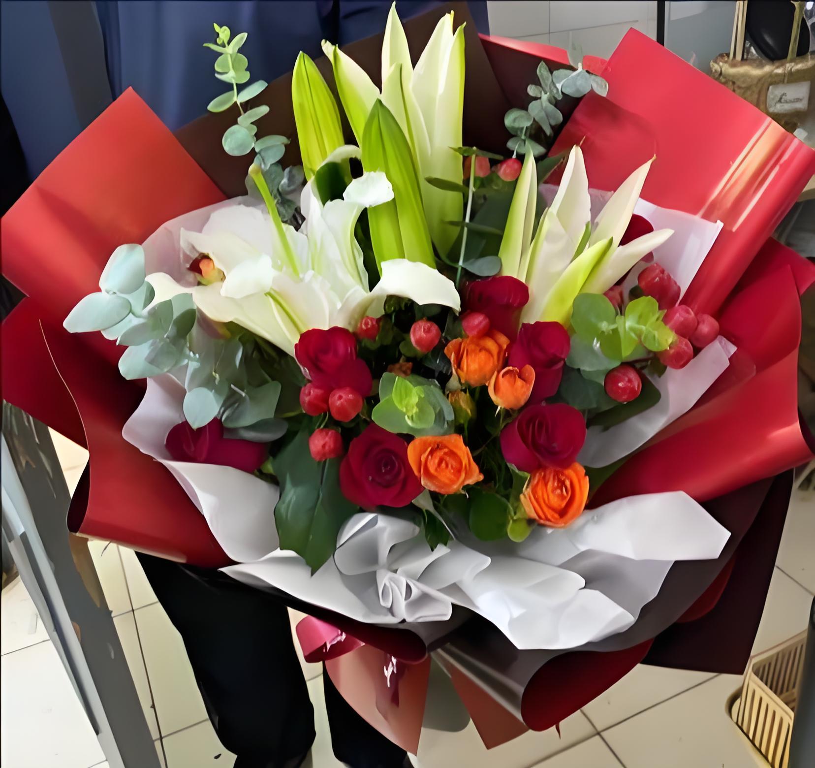 铜仁花店包11枝红玫瑰、2枝多头白百合、6枝橙色多头玫瑰、红豆、尤加利叶
